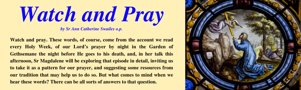 Some of us, perhaps, may hear in them an echo of other occasions when Jesus uses them, or words very like them, when he encourages his followers to be on the alert for his return at the end of time, and that in itself might evoke all sorts of reactions, though this would be another talk for another day, perhaps at our next Advent day of recollection. Perhaps many of us on hearing them are anxious that we will be unable to watch and pray as we would like to do this week, and as we feel the Lord asks of us: after all, in the Garden of Olives, Peter, James and John were unequal to