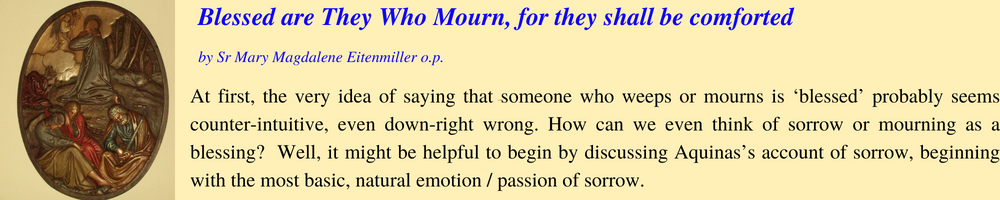 ‘Blessed are those who mourn, for they shall be consoled’: At first, the very idea of saying that someone who weeps or mourns is ‘blessed’ probably seems counter-intuitive, even down-right wrong. How can we even think of sorrow or mourning as a blessing? Well, it might be helpful to begin by discussing Aquinas’s account of sorrow, beginning with the most basic, natural emotion / passion of sorrow. He calls it a passion, from the Latin word, pati, which means to undergo something.